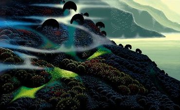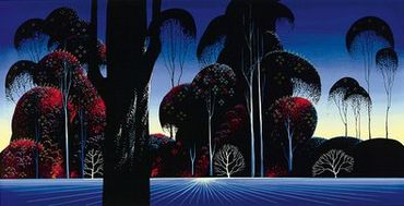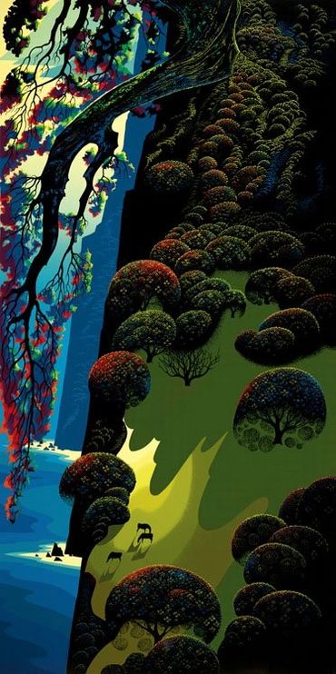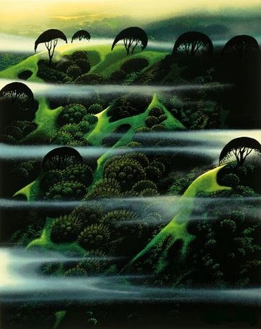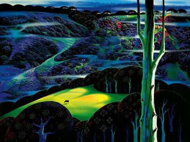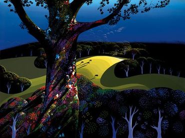 After about 15 years creating animated art, Earle returned to painting full time in 1966 and kept working until the end of his life. In addition to his watercolors, oils, sculptures, drawings and scratchboards, in 1974 he began making limited edition serigraphs. Eyvind Earle had a totally original perception of landscape. He successfully synthesizes seemingly incongruent aspects into a singularly distinctive style: a style, which is at once mysterious, primitive, disciplined, moody and nostalgic. He captures the grandeur of simplicity of the American countryside, and represents these glimpses of the American scene with a direct lyric ardor. His landscapes are remarkable for their suggestion of distances, landmasses and weather moods. “For 70 years,” Earle wrote in 1996, “I’ve painted paintings, and I’m constantly and everlastingly overwhelmed at the stupendous infinity of Nature. Wherever I turn and look, there I see creation. Art is creating...Art is the search for truth.”